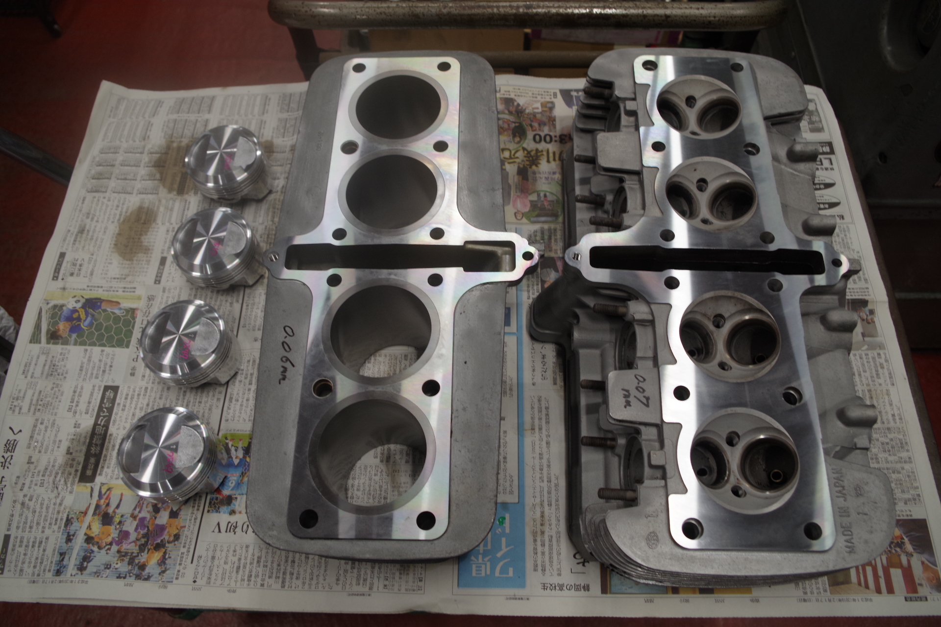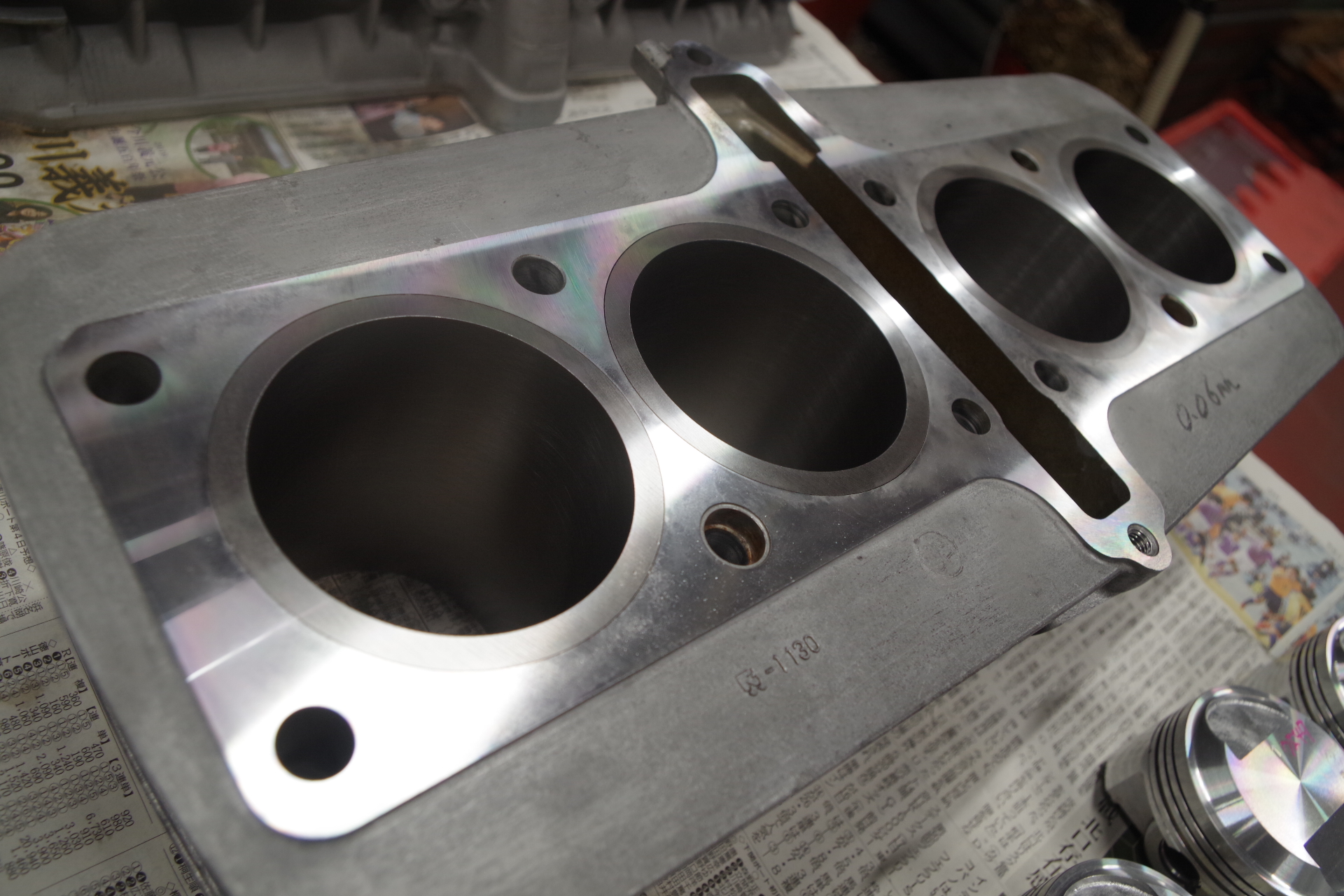 シリンダーボーリング シリンダー上面修正研磨 ヘッド修正研磨。ピストンはヨシムラ製2.0mmO/Sを使用して1120に。ノーマルだと計算上は1060で1100はないです。
