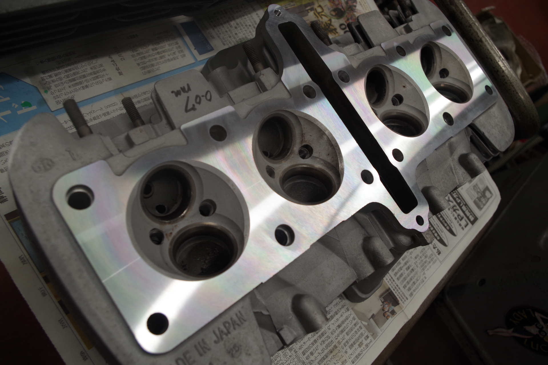 バイメタルであるシリンダーブロックのデッキ面加工はどちらかと言うと切削より研磨が有利。切削だとどうしても筋ばるのと引き目がまばらでよろしくない。ここのとこ色々と試行錯誤して条件次第では切削でもこんな感じに仕上がる事が今回わかりました。