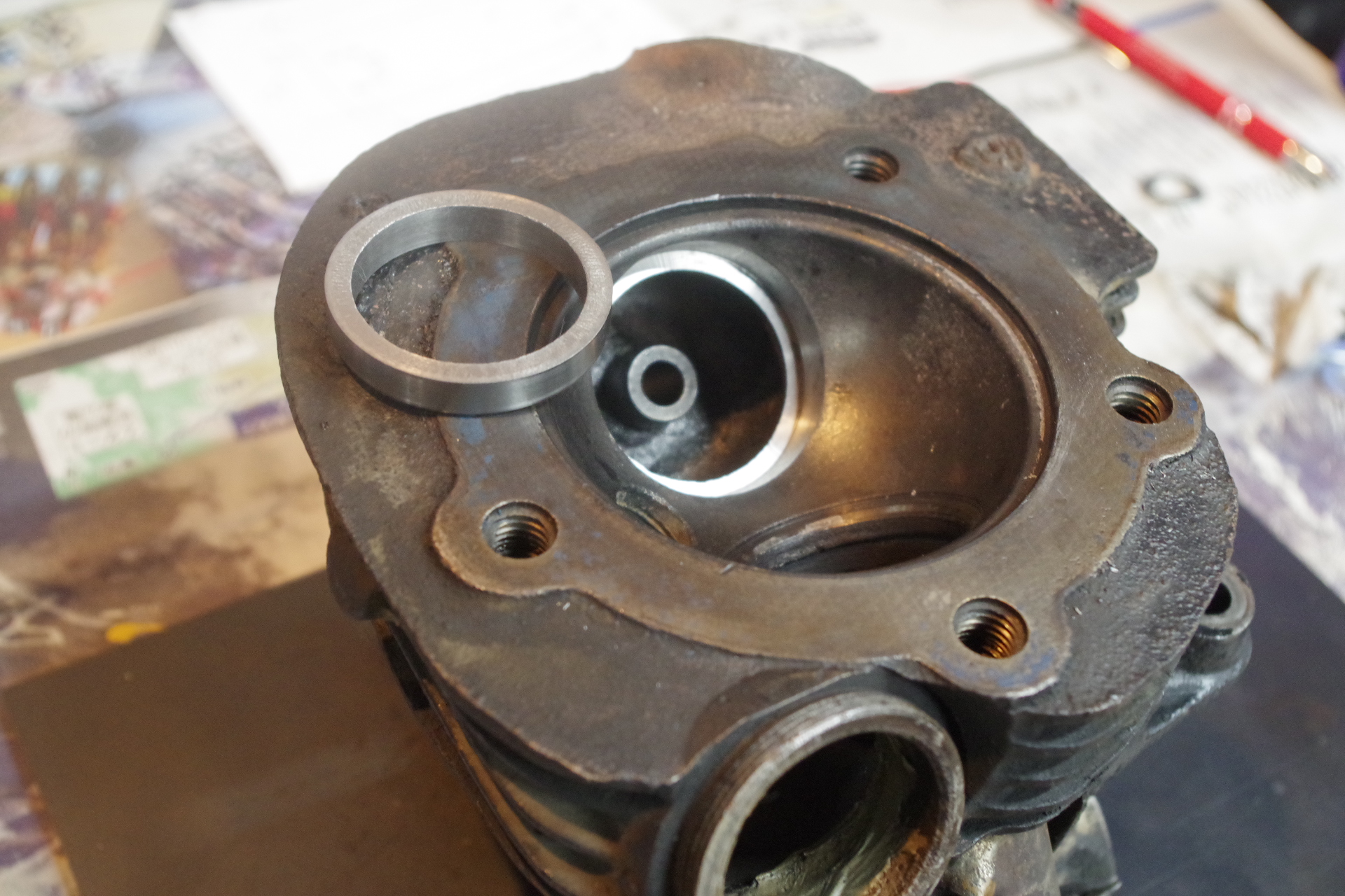 緩ければ落ちるし、キツ過ぎるとヘッド割れます。なのでちゃんとした加工屋に出さないと怖いですよ。ホントに。Vツインでリング売ってるからやってみるかなんて考えちゃダメ。絶対。
