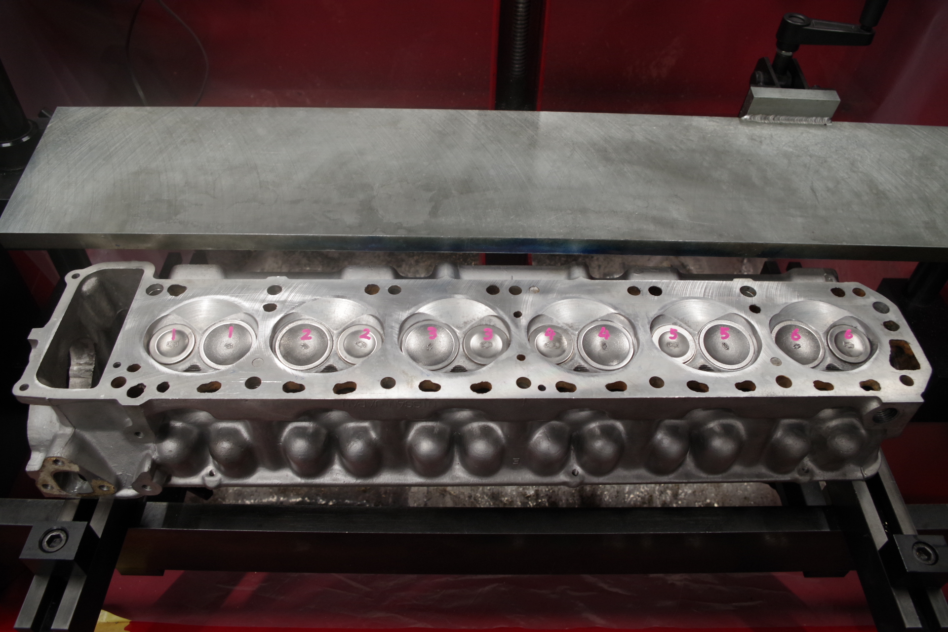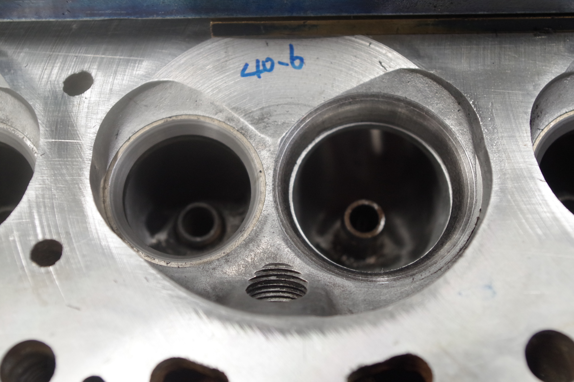 コレも自分の私物。吸気バルブシートの沈み込みがちょっとアレだったので序でにビッグバルブ化です。元々のバルブシートを抜き取りL28純正サイズ44mmバルブに合わせバルブシートの下穴を拡大。排気もL28純正サイズ35mm。そのままカットでいけます。