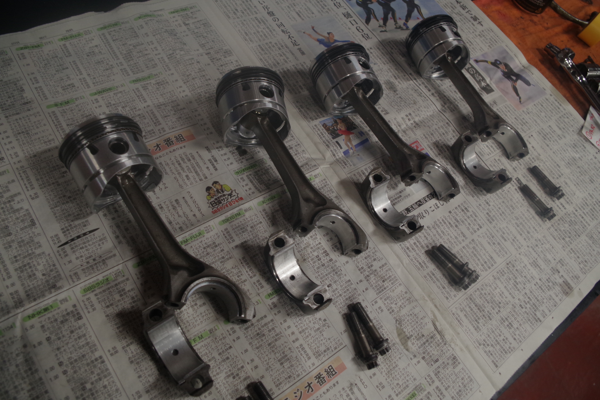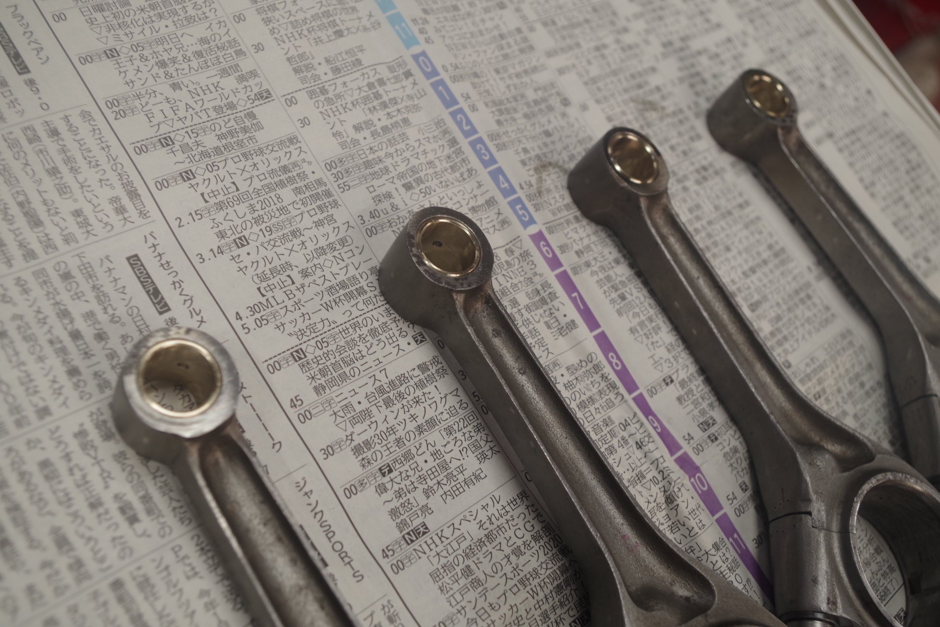 ピストンリングの合口隙間を計測してからピストン、リングともにバリ取りとエッジ処理。本来ならばリングは5本となるところですがセミチューンエンジンの為4本に変更。コンロッドメタルはアンダーサイズのものを新品で使用します。