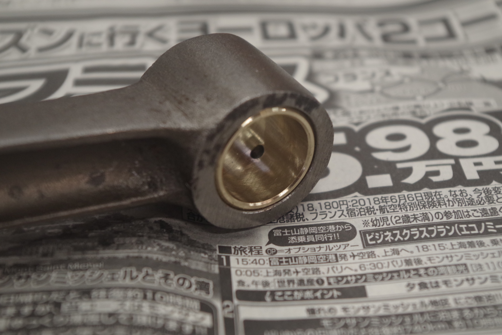 コンロッド小端部ブッシュを抜き取り新規で製作。使用するピンに合わせてフルフロー加工です。