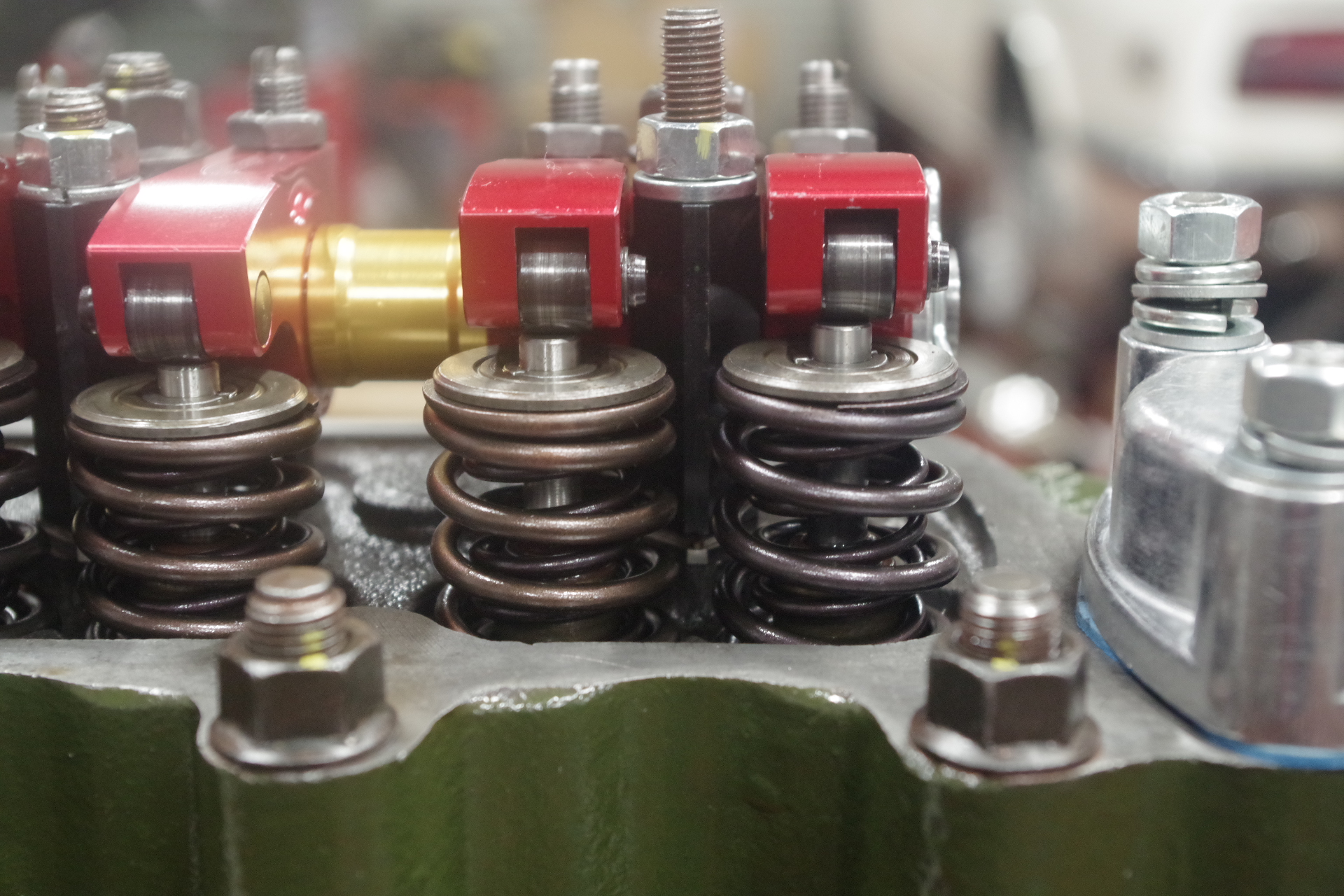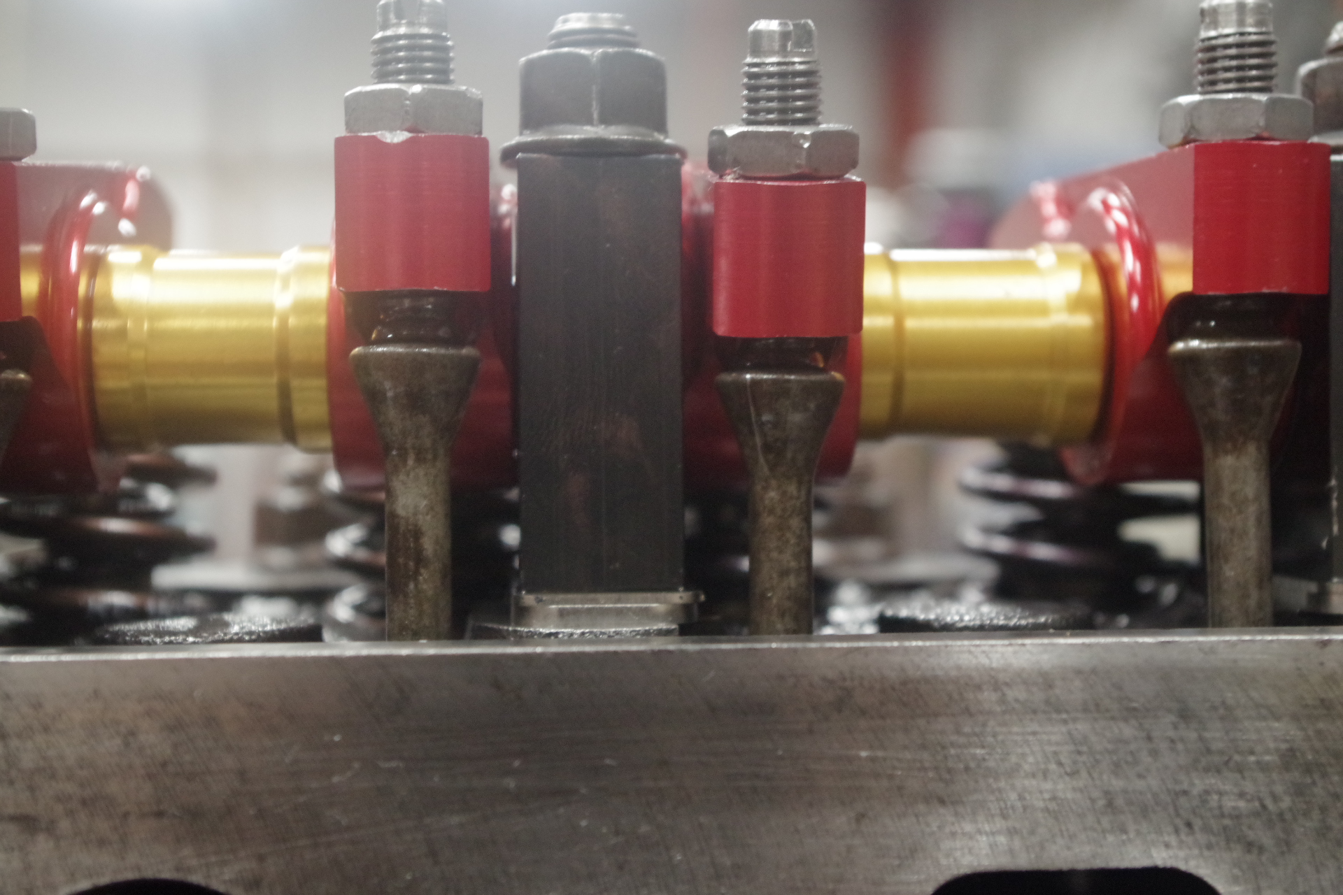 ノーマルロッカーアームから持込みのローラーロッカーアームへの変更ですが、そのまま取り付けるとアジャストボルトが目一杯となりバルブクリアランスが確保できなかったので、ロッカーアームベースに3.0mmのスペーサーをかませてバルブクリアランスを確保しました。 次にロッカーアーム比がノーマルとは異なるため(バルブリフト量が増える)ピストンとバルブの確認作業。やり方は色々とありますが今回はかーなりアナログなやり方です。