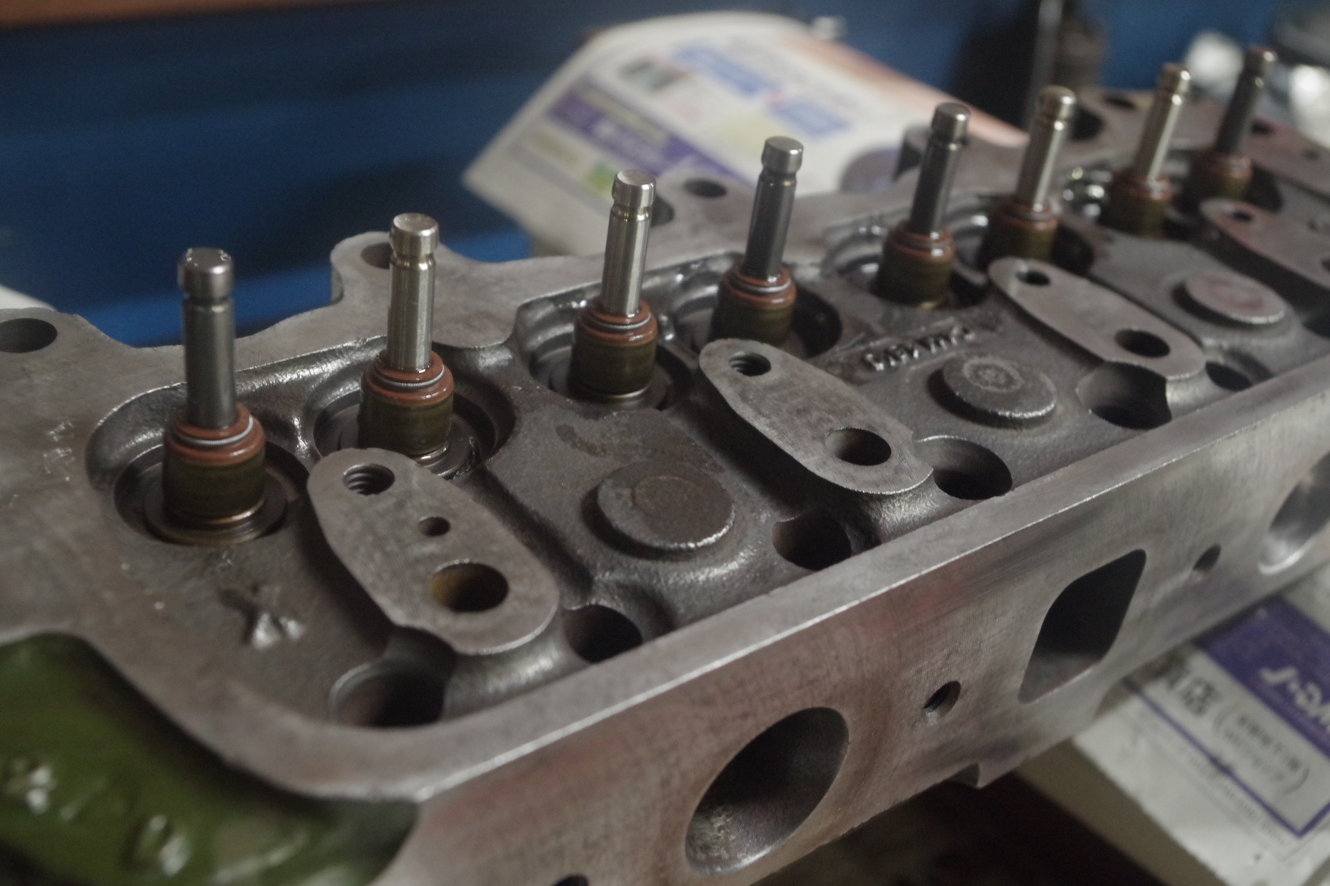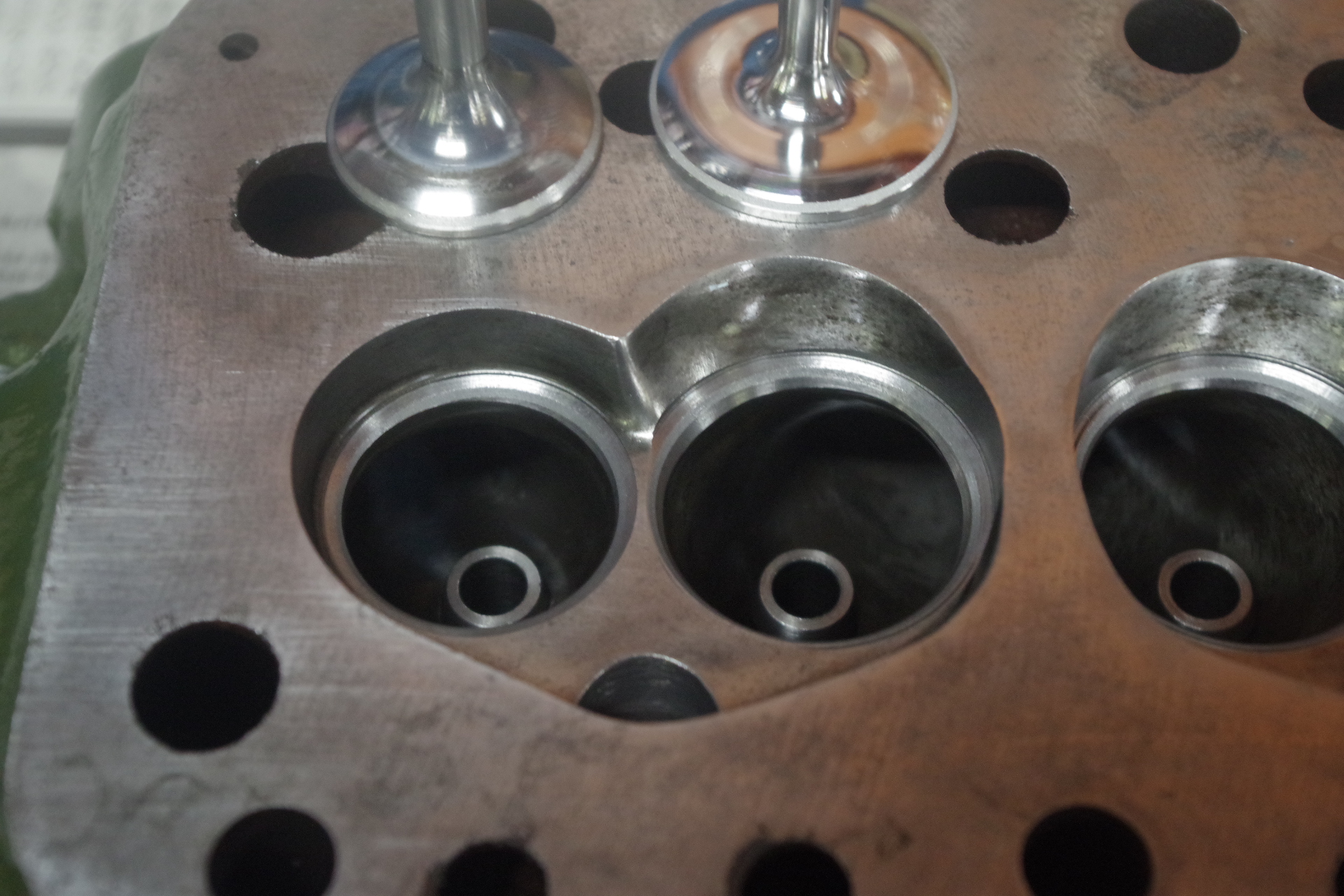 画像はバルブガイドを入れ替えバルブシートカットまで作業が済んだ状態です。この後、下面を修正面研して組上げます。