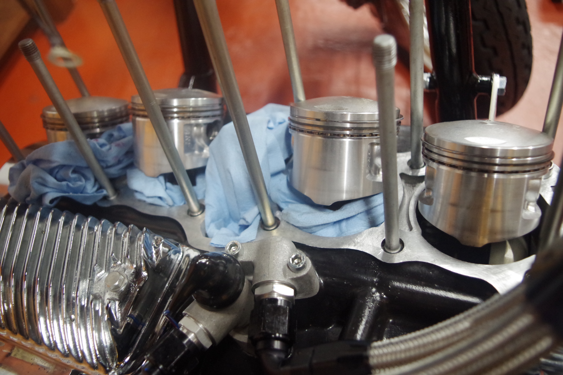 オーバーホール直後は白煙が出ていなかったのと、オーナーさん自身で1度バルブステムシールを交換したが変化ナシという事なので、今回は車両ごと預かりました。先ずはエンジンを始動させ現状確認します。キャブの燃調がかなり濃い状態だったようで始動に手こずりましたが、エンジン始動出来る程度にキャブの調整して難なく始動。始動後エンジンが少し温まってくると白煙と黒煙が確認出来ました。もう少しキャブを煮詰めてからでもよかったとは思いましたが、圧縮を測ると2番だけ数値が極端に低かったので画像の状態に。ピストンには傷もなくあたりすら付いてないキレイな状態が確認できました。リングも手に取った感じでは特に異常がある感じはありません。