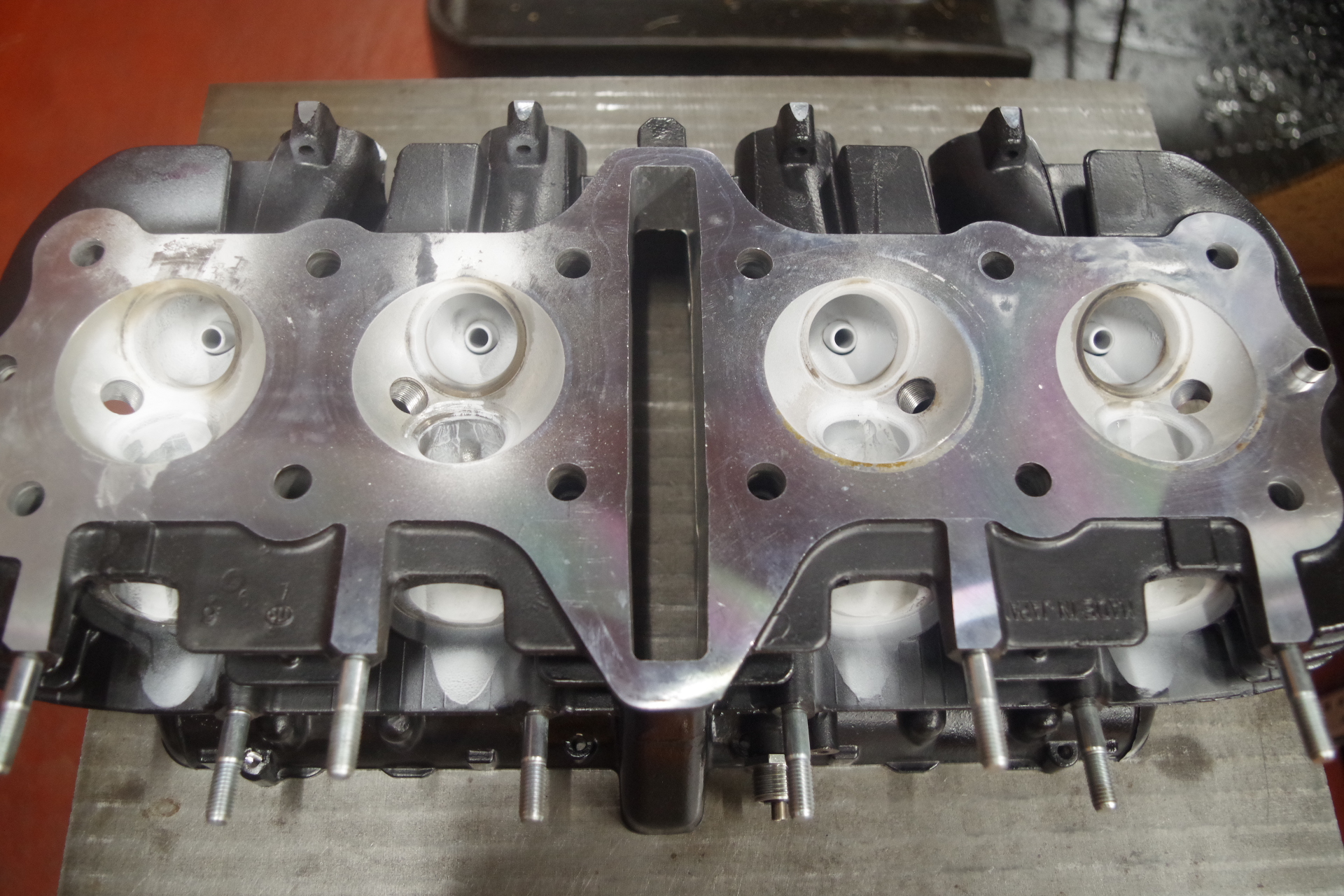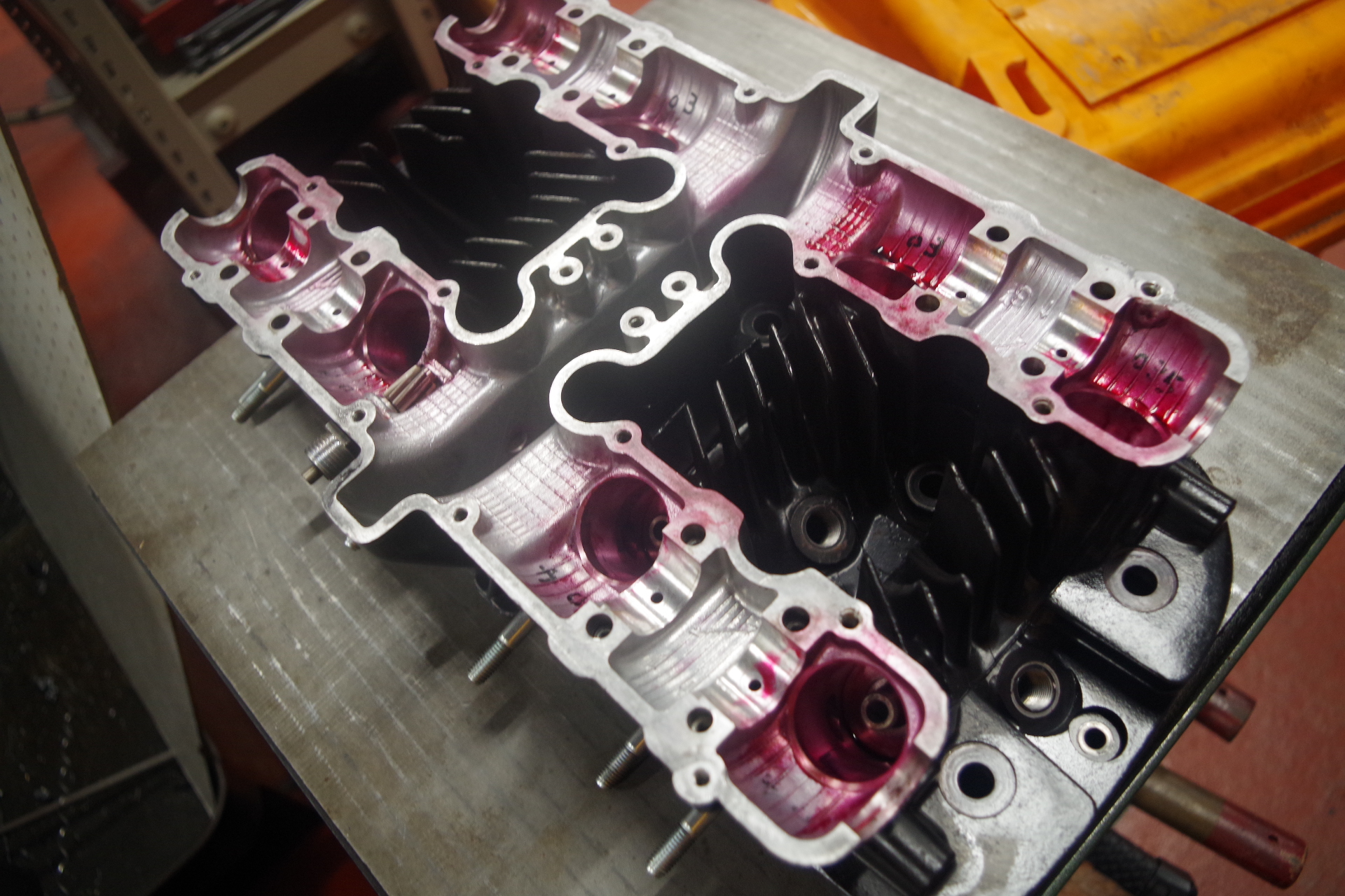 念には念を入れヘッドのバルブ周りをレッドチェックします。バルブガイドの入れ換え作業時には必ずレッドチェックして納品しています。おかげで手直しなんてここ何年もやっていないから正直自信はあるけど、人が作業していますから万が一って事も考えられます。